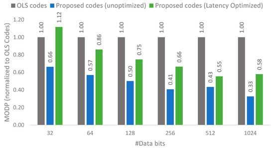 From both Table 1 and Table 2, it can be seen that OLS codes have an overall good performance in terms of latency, area and power consumption, but OLS codes do suffer from high memory overhead. The proposed codes focus on reducing the high memory overhead of OLS codes while still maintaining an adequate decoder latency to enable good performance. Thus, a memory-overhead delay product (MODP) metric is used to make this comparison. Figure 12 shows the MODP comparison normalized to OLS codes (i.e., OLS codes will have a MODP of 1) for both the unoptimized proposal and latency optimized proposal. Since there are multiple possibilities of the number of groups for the proposed codes, the best MODP value is plotted against OLS codes. It can be seen that the proposed codes are able to achieve much better MODP compared to OLS codes, with the MODP as low as 0.33 times OLS codes. This is possible due to the low memory overhead of the proposed codes. The key takeaway from this figure is that the proposed codes are able to achieve much lower memory overhead without a corresponding significant rise in decoding latency.