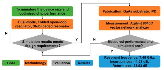 In this study, a dual-mode BPF is proposed, simulated, and fabricated using stub-loaded resonators (SLRs) consisting of a folded open-loop resonator (FOLR) and a center-loaded stub. Zhang first demonstrated that stub-loaded open-loop resonators can be used for a dual-band BPF design owing to the dual-mode resonators [17]. However, in this dual-mode BPF design, the even-mode resonator was designed with a high-frequency stopband to realize an ultrabroad out-of-band suppression of up to 20 GHz. Two tunable extra transmission zeros (TZs) can be shifted by changing the impedance of the designed even-mode resonator and the coupling between adjacent SLRs. Based on the above description, modified SLRs are introduced to design a dual-mode BPF with ultra-high out-of-band suppression using a high-performance GaAs-based IPD fabrication process. The flowchart of the designed BPF is shown in Figure 1.