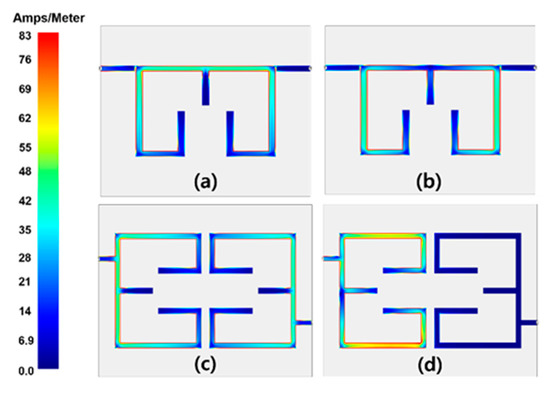 where c is the speed of light in free space and εeff represents the effective dielectric constant of the substrate, and the symbols La, Lc, Wa, Wb in Equation (1) are related to Figure 2a. We observe that fodd is only determined using the outer length of the folded open-loop resonator. Figure 2a shows that the proposed SLRs are electrically shorted from the simulated current density during the odd-mode operation, which verifies the abovementioned phenomenon.