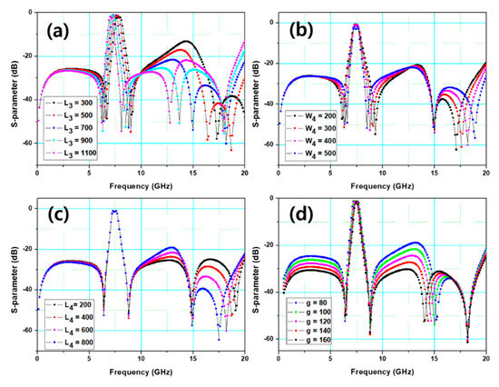 Simulated results of the proposed dual-mode BPF for different (a) L3, (b) W4, (c) L4, and (d) g parameters.
