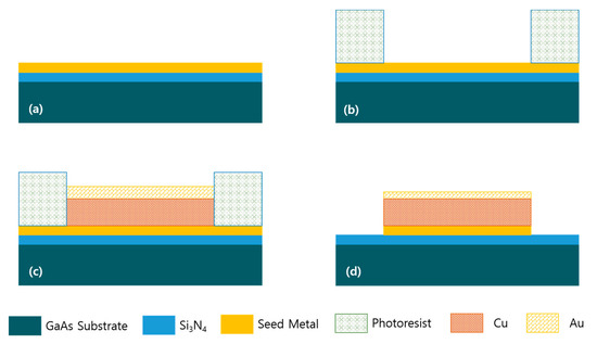 Schematics of the proposed BPF device fabrication. (a) Wafer passivation of 200 nm thick Si3N4 deposited by PECVD and 100 nm thick gold seed metal deposited by sputtering. (b) Plating mask lithography and development. (c) Cu/Au (4.5 µm/ 0.5 µm) metallization by plating. (d) Removal of photoresist by lift-off and seed metal dry etching for chip isolation.