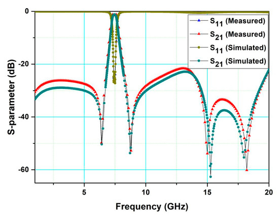Figure 7 shows the simulated and measured S-parameters of the proposed BPF with an open-loop resonator and SLR. A high performance BPF is achieved with ultra-high out-of-band suppression using SLR. The center frequency of the measured results was located at 7.45 GHz with a low insertion loss of −1.21 dB, a return loss of −23.53 dB, and a 3-dB FBW of 5.8%. Four TZs are located at 6.42, 8.72, 15.26, and 17.97 GHz with attenuation levels of −50.33, −53.66, 62.66, and −55.32 dB, respectively. The measured RF performance shows a good agreement with the simulated one, thereby verifying the proposed design concept and the advanced III–V compound semiconductor-fabrication processes. The reasons for the slight difference between the measurement and simulation results could be attributed to the lack of an accurate connection among the connectors because of the manual soldering of the PCB input and output matching lines [19]. Table 1 compares ours to similar reported designs, which also proves the superior merits of this proposed BPF chip.