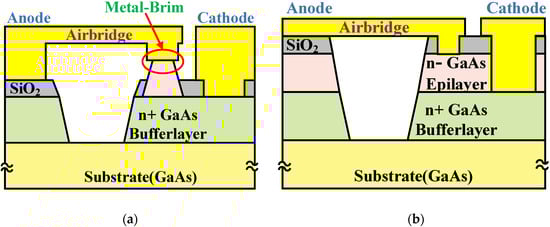 Cross-sectional schematics of GaAs Schottky barrier diodes (SBDs): (a) Schottky metal-brim (SMB) terminal structure; (b) conventional terminal structure.