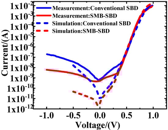 To explain this, we first note that random variations in the epitaxial material and processing technology result in leakage currents, which are not accounted for in Equation (1). This affects the simulation results for both SBD structures equally. Secondly, unlike the proposed SMB terminal structure, the conventional SBD terminal structure introduces an additional direct current path between the anode/depletion layer and the cathode, as illustrated in Figure 4, which is also not accounted for in Equation (1), and directly impacts the accuracy of the simulation results for the conventional SBD structure.