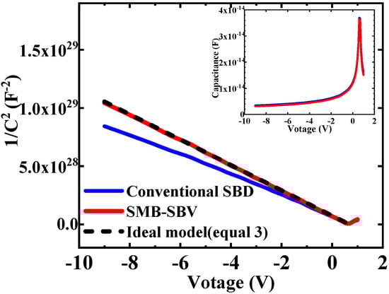 Comparison between the values of 1/C2 obtained for the two different SBD structures based on 1-D DD simulations and the ideal model given in Equation (3). The simulations were based on an ideal surface potential. The inset presents the simulated C–V in linear scale.