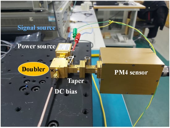 The cavity of the designed doubler is made of brass material, and the entire surface is gold-plated. The doubler MMIC is fixed and grounded by conductive adhesive, which is shown in Figure 7. The measurement setup employed for testing the frequency doubler MMICs is presented in Figure 8. Here, an Agilent E8257D analog signal generator (Santa Clara, CA, USA) was followed by a W-band, active ×8 frequency multiplier to generate an input signal in the 86–106 GHz band with a typical output power of +10 dBm. The output power of the frequency multipliers was measured using a VDI Erickson PM4 power meter (Charlottesville, VA, USA). In addition, a KFD55 Sub-Miniature version A (SMA) coaxial RF connector (Xi’an, China) was connected to the main transmission circuit using gold wire bonding, and a low forward bias (+0.8 V) was applied to the SMA port to bias the SBDs in the doubler MMICs. Two doublers based on different Schottky barrier diode (SBD) terminal structures were tested.