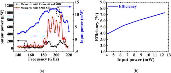 The measured output power of the frequency doubler MMICs constructed using the conventional SBD and the proposed SMB structures is shown in Figure 9a with respect to frequency along with the input power. The measured output power of the frequency doubler MMIC constructed using the proposed SMB structure is greater than 0.5 mW in the range from 188 to 208 GHz, and the maximum output power is about 0.914 mW at 208 GHz. In contrast, the maximum output power of the frequency doubler MMIC constructed using the conventional SBD structure was only 0.216 mW at 206 GHz.