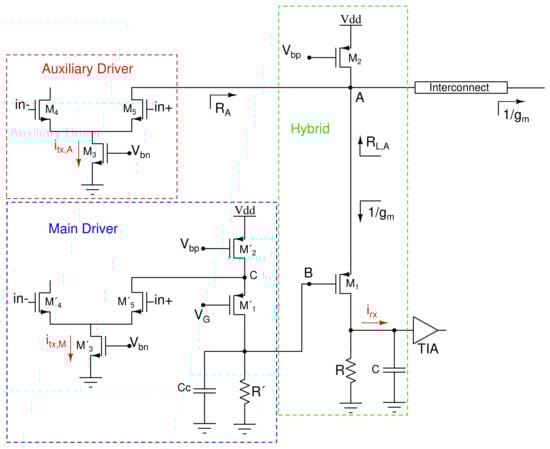 As known, by virtue of its transconductance (), converts changes in its source-gate voltage () to a small-signal drain current []. Therefore, by generating the same and equal signals at the gate and the source of the (=), no variation comes from the transmitting signal. Consequently, the drain current of the hybrid device is mainly a function of the received signal () from the second transmitter on the other side of the interconnect, which is sensed on . Then, the sensed inbound voltage signal () is converted to the current () by the of the hybrid device.