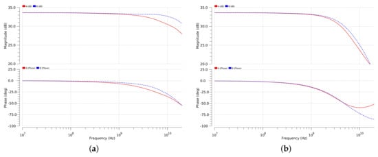 With the use of simulations, the magnitude and the phase responses for nodes A and B can be obtained. They are reported in Figure 3. Figure 3a,b show the effect of before and after adding it to the main driver output, respectively.
