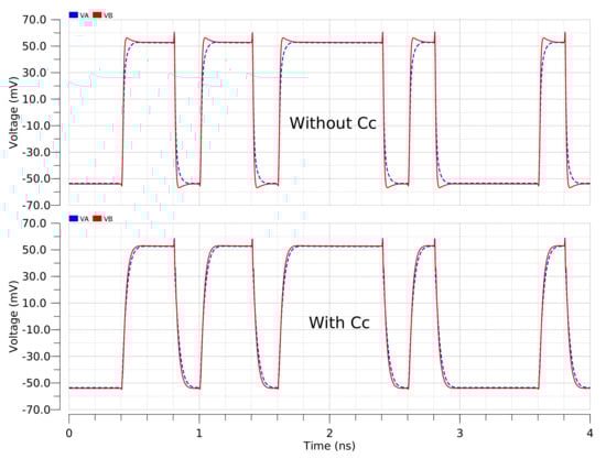Figure 4 shows that after adding , the signal at node A follows the signal at node B with less error during transition (similar rise/fall times).