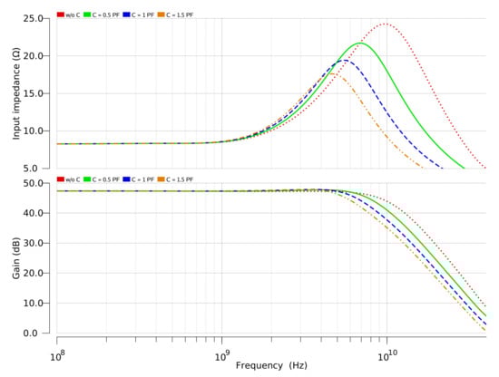 After sensing the inbound signal and conversion to current by the hybrid device, a TIA can be used to amplify the received current signal. It should be mentioned that the input impedance and bandwidth of the TIA will be changed due to the use of the capacitance C. Simulations have been implemented to verify the effect of using different values of C and the results are plotted in Figure 6.