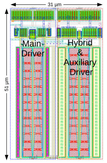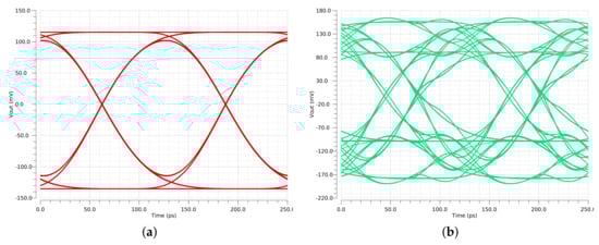 In this section, the most important performance indicators for the proposed on-chip full-duplex transceiver (e.g., eye-opening, BER, power consumption, robustness against the PVT variations and corner simulations) are analyzed. For this purpose, circuit design for the proposed system has been realized. Figure 7 shows the layout screenshot of the FDT operating at 16 Gbps data rate, which occupies an area of 51 m × 31 m. In order to verify the performance of the proposed FDT, the post-layout simulations have been performed in 28 nm TSMC CMOS process. The functionality of the FDT is validated over an on-chip interconnect with a length of 5 mm []. The link has a width of 0.6 m and a spacing of 1 m with the adjacent shield layers.