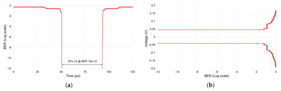 (a) Horizontal and (b) Vertical bathtub curves for full-duplex signaling of 16 Gbps.