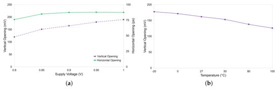 Variation of eye opening with: (a) supply voltage and (b) temperature variations.