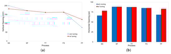 (a) Vertical and (b) Horizontal opening of the eye at different process cornes with and without tuning the auxiliary driver at worst corners.