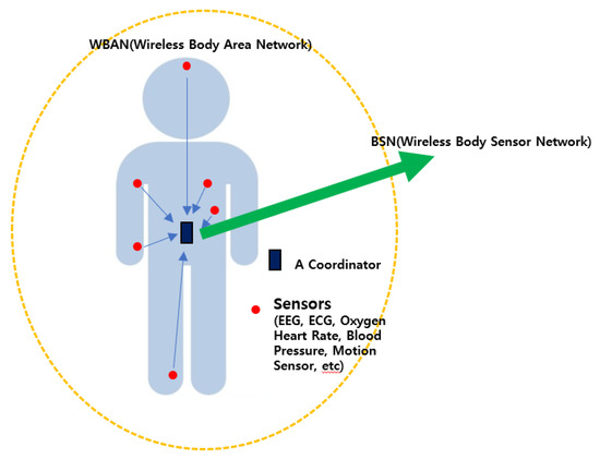 Here is some related research regarding the MAC layer. One of main goals of MAC protocol is to reduce power consumption from sources such as idle times, bandwidth, overhearing, and collision. The composition of the BSN can be expressed as shown in Figure 2.