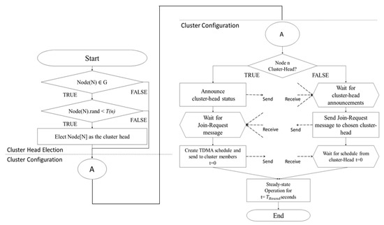 where p is the selection probability of the cluster head, r is the current round, and G is the set of nodes that were not elected as the cluster head until the previous round. The value of Equation (1) shall be between 0 and 1. Each node generates a random number value between 0 and 1 and is compared to Equation (1); then a node with a random number value less than the result of Equation (1) is elected as the CH. After CHs are selected, clusters are formed as follows. The selected CHs broadcast advertising messages, including their own data, to surrounding nodes. Nodes that receive advertising messages from CHs form a cluster by sending a join-request message to join the CH which is transmitting with the highest signal power; nodes can read the RSSI (received signal strength index). When all clusters’ configurations are completed, CH creates the time division multiple access (TDMA) schedule that tells each node the time to transmit, depending on the number of member nodes.