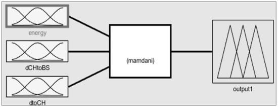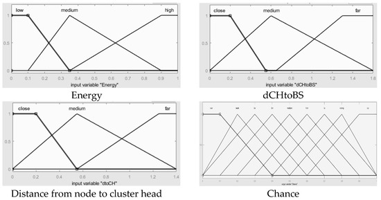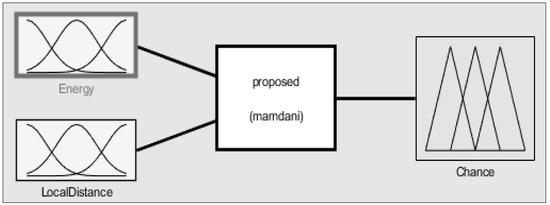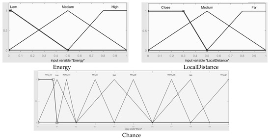 After deciding on CHs, clusters are formed with several non-CH nodes. The second FIS considers the energies of the CHs, distance from BS, and distances between nodes and CHs among on-CH nodes, and obtains the chance values from these three inputs. Figure 8 is the second FIS block diagram for the cluster configuration process. The inputs and output of the second FIS are described in regard to variable names and meanings in Table 3. Membership functions of the FIS are set like Figure 9 to get optimal cluster formations to get optimal performances in terms of energy.