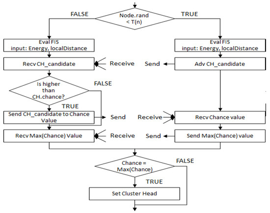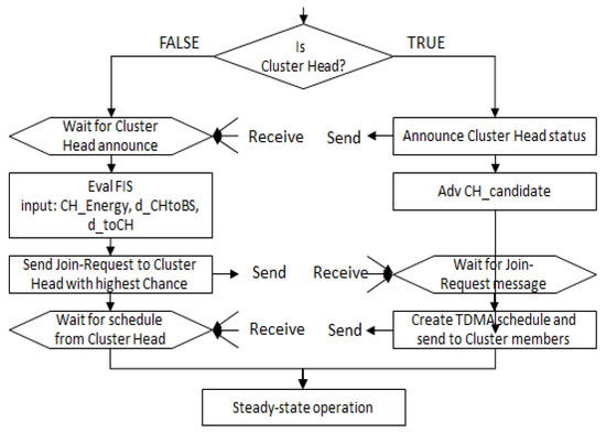 Once clusters are formed, each node transmits the measured data to its CH, and then, CHs collect the data and aggregate the collected data if needed or necessary, and send the fuzzed data to the BS. The clustering formation process is described in Figure 10 in detail.