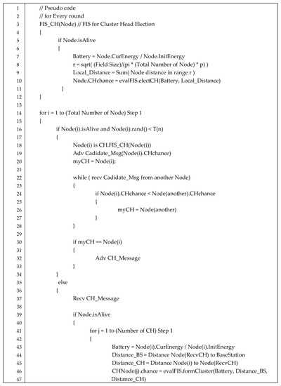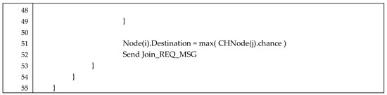 The following Figure 11 shows the proposed algorithm’s pseudocode. Lines 13–49 of the code are the CH selection and cluster configuration section. Line 15 is the part that determines whether the node’s random number is less than the T(n) of LEACH if the node is alive. If true, the CH selection section, lines 17–31 will be executed. Line 18 is a FIS operation function, and lines 3–12 are its executing code. If the conditions of line 15 are false, the node becomes a member node and progresses to lines 35–48, which are part of the cluster configuration.