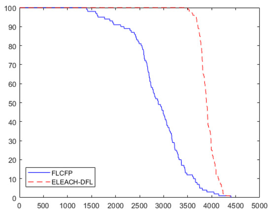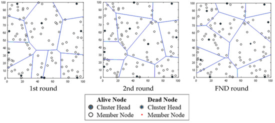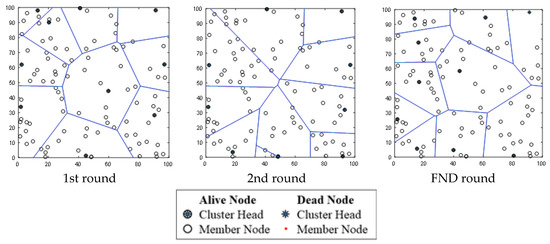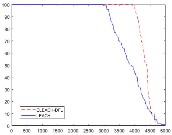 Table 6 shows the constellation of sensor nodes and clusters when the proposed protocol is adopted, when the location of BS is set to (50, 50) at the inside of the sensor field at first, second, and FND rounds. The FND takes place in 3942 rounds. The FND of the LEACH protocol is 2983. The FND efficiency improvement rate of ELEACH-DFL over the LEACH protocol is approximately 32%. The results are confirmed in Figure 12 and Figure 13.