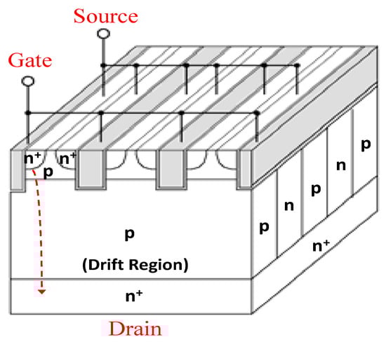 Moreover, in Figure 1, a new device-structure concept called the drift-region embedded super-junction (SJ) implemented in the vertical power device has been available commercially, which would break through the silicon device limit [,,,,,,,,,,,,,,,,,,,,]. CoolMOS is registered by Infineon Technologies [], these high-voltage SJ MOSFETs of CoolMOS components address applications for smart-phone chargers, notebook adapters, LED lighting as well as audio and TV power supplies. Here, the SJ idea is based upon achieving charge compensation in the off-state of a power MOSFET, in a set of alternating and heavily doped N- and P-pillars in the drift region of the high-voltage component. Meanwhile, provided that all of the pillars of SJs are fairly narrow and net dopants in both pillars are approximately equal, it is possible to deplete the pillars at relatively low voltage. Under the depletion situation, the N- and P-pillars appear to be an intrinsic (very low doped) layer and a near uniform electric field in the drain-side is achieved, therefore, resulting in a high breakdown voltage. However, in Figure 2, the SJ concept can be applied for lateral high-voltage devices because the charge interaction between the substrate (bulk) and SJ region exists, which is called the substrate-assisted depletion effect [,,,]. Of course, the breakdown-voltage behavior of this structure will be influenced.