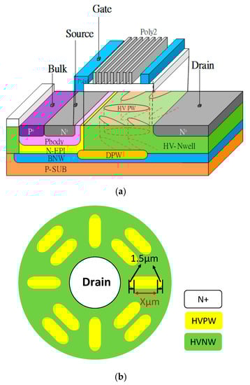 Next, the cross-sectional view and layout diagram of a UHV 300 V nLDMOS with symmetrical eight-zone elliptical cylinder SJs (type-M8) in the drain region are presented in Figure 4. This novel arrangement is taken as the length of X (length X) modulation of the HVPW layer embedded in the drain-side drift region. Then, this arrangement is set to increase the length X of the HVPW zone shown in Figure 4b, and which are 5, 10, 15 and 20 μm, respectively. Meanwhile, the width (thickness) of these entire elliptical cylinder SJs are kept to 3 μm. Therefore, this study will mainly discuss the impact of HVPW distribution and how the HBM ability is affected by the HVPW length X.