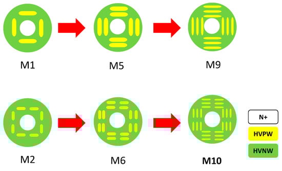 In Figure 6, the following items are the SJs’ number modulation of symmetrical four-zone elliptical HVPW cylinders, which are classified as the group A (M1, M5, M9) and the group B (M2, M6, M10), respectively. In these six LDMOS-SJ devices, each has a common feature, that is, the SJ on each side is perpendicular to the SJs on the adjacent sides. Additionally the length X of the HVPWs shown in Figure 6 are 20 μm and 5 μm for the group A (M1, M5 and M9) and B (M2, M6 and M10), respectively. Meanwhile, the thicknesses of these six elliptical cylinder SJs are kept to 3 μm. In the case of increasing the HVPWs in this item, we first set the modulation without affecting the breakdown voltage of the electrical characteristics so much, and it is desirable to understand how the modulation impacted on HBM ESD reliability.