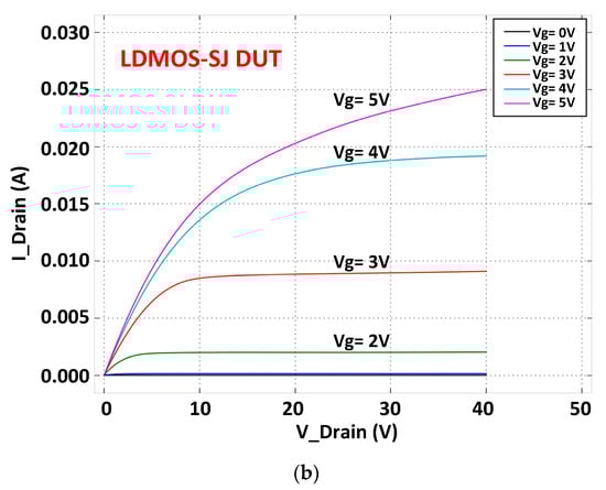 The normal output I-V characteristics of (a) UHV 300 V ref. nLDMOS, and (b) nLDMOS-SJs type-M8 device with X = 10 μm.