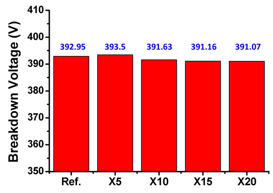 Firstly, the experimental results of normal output I-V characteristics of the UHV 300 V reference nLDMOS and nLDMOS-SJs type-M8 with X = 10 μm are shown in Figure 8. Obviously, these output I-V behaviors changed very little after adding elliptical cylinder SJs. For example, Vg = 5 V and Vd = 40 V, and the drain currents were equal to 2.551 mA and 2.5 mA, respectively. The output I-V variation does not exceed 1.88%. Meanwhile, on the other hand, the breakdown voltages of these nLDMOS related devices with symmetrical eight-zone elliptical cylinder SJs in the drain region are presented in Figure 9. From these experimental results, there is not much change in the breakdown-voltage (VBK) test after adding the SJ structure, which fall between 391 and 393.5 V (the original benchmarked device under test (DUT) is 393 V). The VBK‘s value variation does not exceed 0.51%, it means that the basic electrical properties of the nLDMOS components are carefully controlled so that they do not change much. That is, in this study, we want to enhance the ESD-reliability capability without affecting the original electrical behavior afterwards by painstakingly adding these SJ structures.