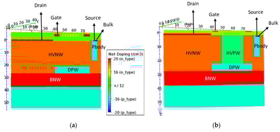 The layout diagram and 3-D cross-sectional view (along the line AB of Figure 3a) of a UHV 300 V circular nLDMOS benchmarked reference device are shown in Figure 3a,b, respectively. In Figure 3a, due to the high operation voltage and high breakdown voltage need, a lightly n-doped HVNW layer is used in the drain-side drift region. The PBody and deep P-Well (DPW) layers will form a reduced surface-field (RESURF) structure, which causes the drift region to be completely depleted and increases the breakdown voltage of the device []. Similarly, the poly2 surround above the drift region is used to increase the breakdown voltage. In the rectangular-type layout, the current will flow through and concentrate at the electrode corner; therefore this component is easily damaged there. Instead, in Figure 3b, the layout of a UHV MOSFET adopts a circular mode due to the conduction current uniformly flowing along the shortest radial-outward path and a circular structure is used in order to prevent the current’s uneven flowing. Meanwhile, a gate-grounded MOSFET (GGnMOS) structure is commonly used in the routing architecture of an ESD protection device, which discharges the instantaneous current of an external transient pulse mainly through the parasitic bipolar-junction transistor (BJT) conduction of this GGnMOS component. These experimental samples were fabricated by a TSMC 0.5 μm UHV BCD process with a channel length L of 2.5 μm and a channel width W of approximately 394.3 μm.