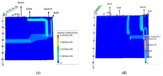 By using the Silvaco EDA software for electric field verifications, Figure 11a,b are the 3-D side view diagrams of a thin-slice structure for the nLDMOS reference device and the nLDMOS-SJ M8_X20 device, respectively. Then, a high voltage of 400 V was applied at the drain terminals of these two DUTs for comparing high electric-field distributions. From Figure 11c, the electric field of the circular nLDMOS reference device was concentrated at the depletion area of the LOCOS edge under this high voltage biase, and the peak value of the electric field is about 1.0247 × 106 V/cm. However, in Figure 11d for the nLDMOS-SJ M8_X20 device, the electric field is concentrated between HVPW and N-EPI, and the depletion region by the SJ (HVPW and HVNW). The maximum electric field of the nLDMOS-SJ M8_X20 device is downgraded to approximately 1.9192 × 105 V/cm, and the peak value of this electric field decreases to the ratio of 18.73% compared with the nLDMOS reference device. Obviously, it reveals that the nLDMOS-SJ structure can indeed reduce the peak electric field of the device.