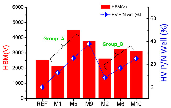 Next, for proof again by the symmetric four-zone elliptical cylinder SJ modulation, the HVPW structures (M1, M5 and M9, and M2, M6 and M10) are embedded in the drain side, and the HBM values are presented in Figure 12. Because they are not as highly symmetrical as the type-M8 devices, the HBM capability versus the HVPW/HVNW area ratio cannot be satisfactorily linearly related, but can be with another high-order proportional relationship for these group A and B samples. Nevertheless, the HBM ESD capability is somewhat higher with the increase in the number of HVPW SJs. The highest HBM value of M5 (4500 V), its (the M5) ESD capability, is improved by 80% as compared with the original benchmarked GGnLDMOS DUT. Meanwhile, it is found that the HVPW/HVNW area ratio of the group A samples is generally higher than that of the corresponding group B devices, so their ESD HBM abilities are also relatively high. In the case of M9 and M10 (three HVPW SJ arrays in the outward direction), HBM values are downgraded than that of the M5 and M6 (two HVPW SJ arrays in the outward direction). This is caused by the thin-oxide definition (OD) distance from the outermost HVPW to the gate and the heat dissipation cross-sectional area being too small, resulting in a decreasing data value in the HBM robustness.