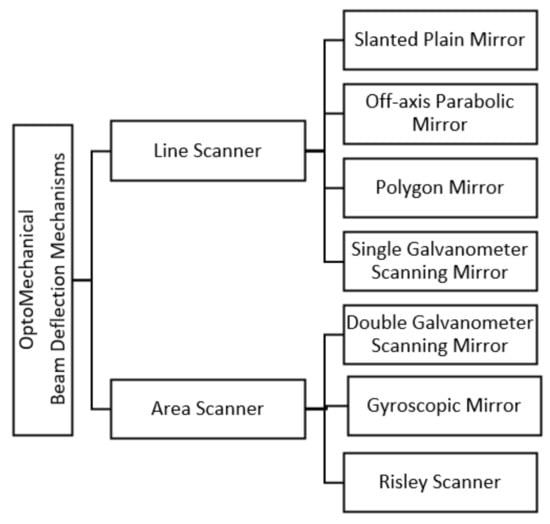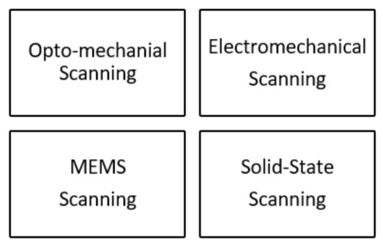 As stated earlier, a LiDAR instrument without the beam deflection subsystem is often called an LRF. This instrument is only suitable for collecting spatial information from one point to another. In order to obtain the 2D or 3D spatial information from the environment, the laser beam transmitted by the LRF must be deflected. There are several beam deflection mechanisms (often referred to as scanning methods) being employed. They are broadly clustered into four categories: Opto-mechanical, electromechanical, MEMS, and solid-state scanning methods, as shown in Figure 4. In the following subsection, each beam deflection method will be discussed in detail.