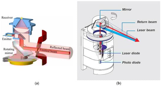 Figure 6a illustrates an opto-mechanical scanning method implemented in a SICK 2D LiDAR instrument. In this instrument, a single mirror mounted at 45 degrees is employed for deflecting the laser beam. This mirror is driven by an electric motor installed at the bottom of the device. This arrangement reduces the design complexity. The laser diode and photodiode utilize the same mirror to transmit and receive laser pulses consecutively, and is thus known as the coaxial type, where both the receiver and transmitter share the same path [15]. FOV of this instrument is limited to 180 degrees. Hence, it is not suitable for applications that require omni-directional scan.
