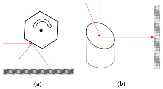 Besides the usage of flat mirrors, there are also other types of mirrors, such as polygon and parabolic mirrors, as reported in past literature [17]. An illustration of the scanning mechanism using polygon and parabolic mirrors is presented in Figure 7. One of the disadvantages of using a polygon mirror is that it has limited FOV. Thus, these mechanisms are mostly suitable for applications that require a region scanning, whereby information limited to a rectangular region is required. On the other hand, off-axis parabolic mirrors can scan with a greater FOV in contrast to polygon mirrors. It is most suitable for either bounded or full field scanning in the azimuth plane. Although 2D scanning mechanism using a galvanometer head mirror is possible, there is inadequate information regarding this design in the literature. It is believed that galvanometer scanning mirrors are not popular because of the high initial investment required for its development. Second, the galvanometer scanning mirror have a limited FOV because of the small size of the mirror.