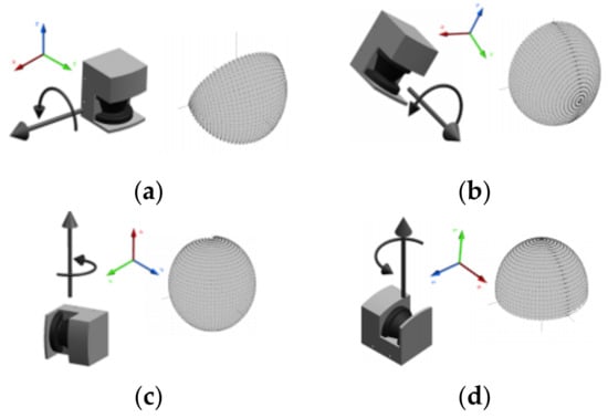 Electromechanical scanning configurations and its corresponding measurement density distribution; (a) pitching scan, (b) rolling scan, (c) yawing scan, (d) top yawing scan [26].