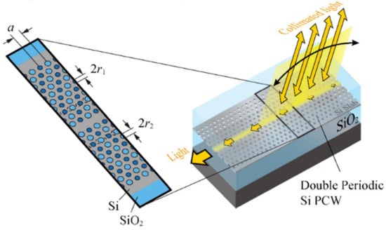 In east Asia, specifically in Japan, a team of researchers is taking a different approach to realize solid-state LiDAR systems using slow light technology [77,78,79,80,81]. Slow light technology relies on the manipulation of the group velocity of light. This is completely a different approach in contrast to OPA. Such a manipulation is achieved with the use of silicon photonic crystal waveguide (PCW). Figure 12 illustrates the optical beam steering when a light passes through a PCW. A similar device can be used as a receiver to receive light from free space [77]. To our best knowledge, the term “slow light LiDAR” is coined by this research team group [81]. Although a total integration of transmission and reception has not been established yet, the team advocates that slow light LiDAR can overcome the pitfalls of OPA technology.