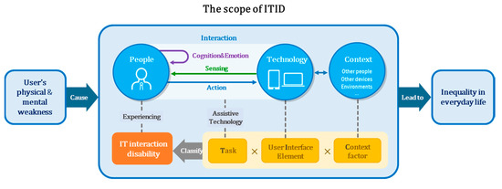 ITID refers to the comprehensive difficulty experienced by people while using an IT device, and this difficulty encompasses not only the situation of using media content but also the difficulties that arise when using the IT device’s hardware and software, as shown in Figure 1 [3]. This suggests a new perspective for accessibility, in terms of interaction using products, rather than individuals’ physical or mental disabilities.