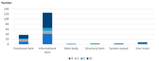 A total of 178 ITIDs were mapped to a UIE, and nine ITIDs were not mapped to the UIE. All the unmapped ITIDs were related to ITIDs in assistive technology functions or assistive products. There were 13 and 165 hardware- and software-related ITIDs, respectively. The ITIDs related to informational items were the most frequent, and the visual information was 74, as well. Table 8 depicts an example of the numbers and provisions of ITIDs for each UIE, and Figure 3 reveals the numbers of UIEs mapped to ITIDs in each method.