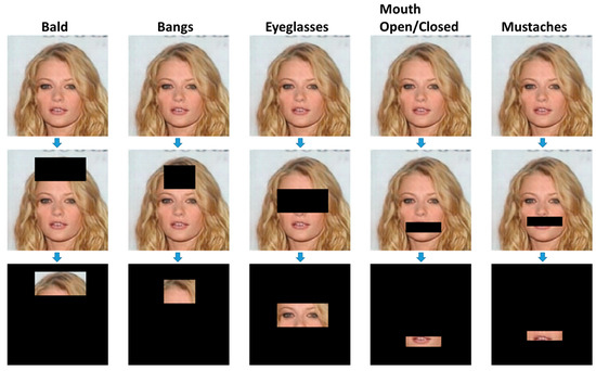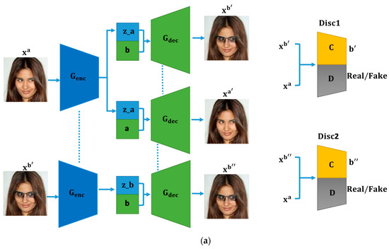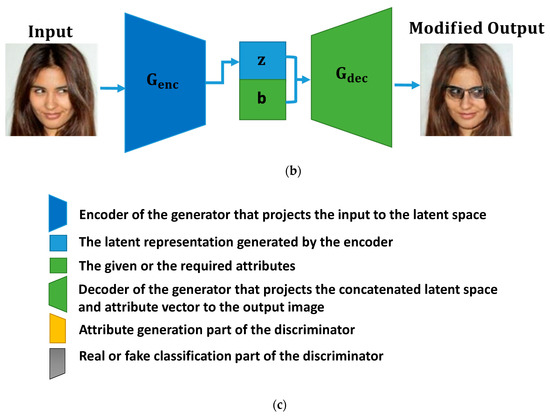 Facial attributes represent intuitive semantic features such as “male”, “female”, “person with eyeglasses” and “smiling” that describe the biological identity or expression of a person. Extensive research has been conducted on the biological identity of human faces in the field of computer vision, from face identification and detection [1,2,3,4] to face-attribute modification [5,6,7]. These approaches were successful based on three factors: (i) access to numerous publicly available training data with labels, (ii) the high computational capabilities of GPUs, and (iii) access to open-source libraries. The availability of the aforementioned resources made it possible for researchers to perform a large amount of work in the fields of face identification, detection, and attribute modification. The prominent facial-attribute modification task is, however, more challenging as compared to those of face recognition and detection, wherein a careful description of the semantic aspects of the face is required while modifying the required attributes, in addition to keeping the face identity intact. For example, if we want to modify a specific attribute, such as hair color, we need to have semantic information about the hair and modify only that part of the image without changing any facial details.