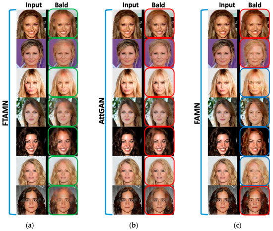 In the first experimental analysis, we evaluated the proposed approach in terms of the baldness of the given input image. If the given image is not bald, the proposed approach will inverse the bald attribute and generate a bald image. The comparison of the qualitative results of the proposed approach with those of the AttGAN [6] and the FAMN [30] in terms of baldness is presented in Figure 2. Figure 2a–c shows the results obtained using the proposed FTAMN, the AttGAN, and the FAMN, respectively. The green frame indicates the required successful modification, the blue frame indicates the successful modification with lost identity, and the red frame indicates the failure of the required attribute modifications. Considering the modified images of the AttGAN, we can observe that the generated images are smooth but their smoothness affects the quality of the modified image, as indicated by the red frames in Figure 2b. In other words, the baldness effect is not distinct in the results of the AttGAN as compared to our results. In the results of the FAMN, we can observe that the generated images show prominent baldness but the identity of the face is affected as indicated by the blue frames in Figure 2c. In contrast, the FTAMN translates the attributes in a prominent manner with considerable smoothness and retains the face identity as compared to the FAMN, as indicated by the green frames in Figure 2a. This proves that, as compared to the AttGAN and the FAMN, the proposed FTAMN is more effective in translating the required attributes to the given input face images.