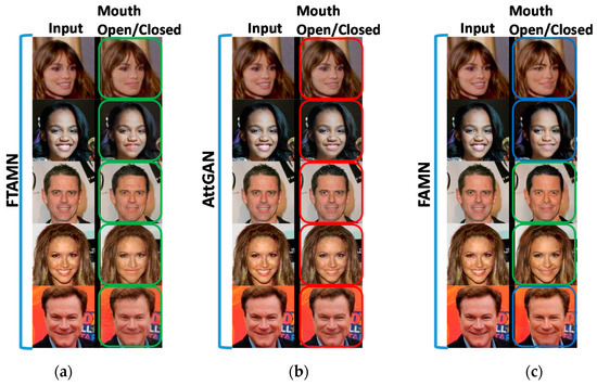 In the second analysis, we evaluated the proposed approach in terms of the mouth open/closed attribute, where the given input image with an open mouth is modified to obtain an output image with a closed mouth. The comparative analysis of the proposed approach with the AttGAN and the FAMN is presented in Figure 3. Figure 3a–c presents the results obtained using the proposed FTAMN, the AttGAN, and the FAMN, respectively. From this analysis, we can observe that the AttGAN translates the input images with an open mouth into the required output images with a closed mouth. However, the attribute modification is not prominent, as indicated by the red frames in Figure 3b. In contrast, the FTAMN translates the required attribute in a prominent manner in the output images, as indicated by the green frames in Figure 3a. The modification performance of the FTAMN is comparable with that of the FAMN, but the FTAMN preserves the face identity in the images better than the FAMN.