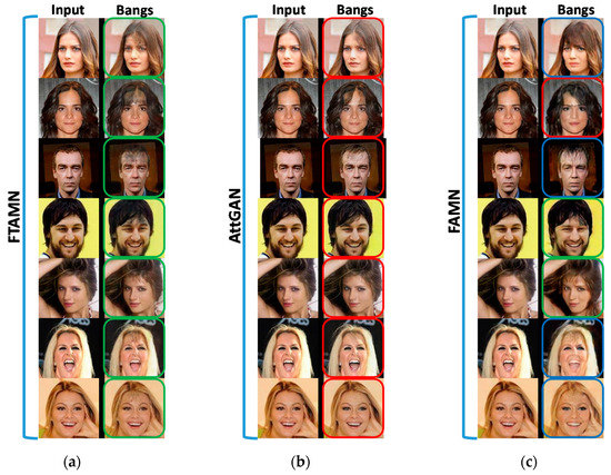 Modification of the bangs attribute in the given face images. (a) FTAMN (proposed approach); (b) AttGAN [6]; (c) FAMN [30]. The input images in the first column of each subfigure are transformed to the output images with bangs.