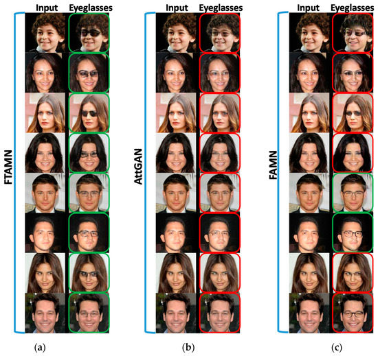 In the fourth analysis, we evaluated the proposed approach in terms of the eyeglasses attribute, where the given input image without eyeglasses is modified into the output image with eyeglasses. The comparative analysis of the FTAMN with the AttGAN and the FAMN is presented in Figure 5, where Figure 5a–c presents the results of the FTAMN, the AttGAN, and the FAMN, respectively. As shown in the second columns of each subfigure in Figure 5, the FTAMN translates the eyeglasses attribute in more prominent manner in the case of a majority of the images as compared to the AttGAN and the FAMN, as indicated by the green frames in Figure 5a. Furthermore, the FTAMN preserves the face identity better than the FAMN, as indicated by the green frames in Figure 5a.