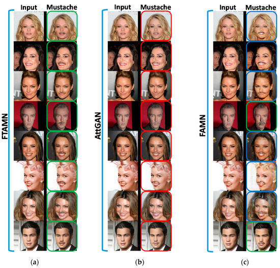 Modification of the mustache attribute in the given face images. (a) FTAMN (proposed approach); (b) AttGAN [6]; (c) FAMN [30]. The input images in the first column of each subfigure without a mustache are transformed into output images with a mustache.