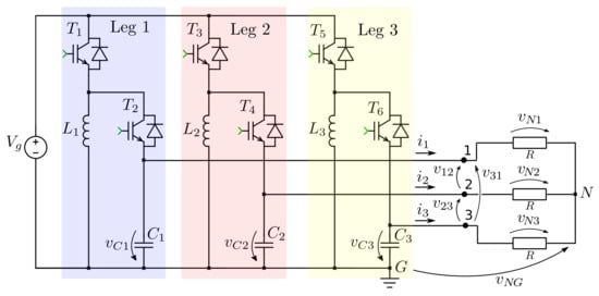 The three-phase Buck-Boost inverter analyzed in this paper is shown in Figure 1. The converter is based in three bi-directional DC–DC Buck-Boost converters (legs 1, 2, and 3), which are able to generate three-phase AC voltages whose peak values can be greater or lower than the DC input voltage in a single stage. If each Buck-Boost converter is controlled to track DC-biased (unipolar) sinusoidal references that are phase shifted by 120 from one another, the output line voltages will be a three-phase balanced sinusoidal system.