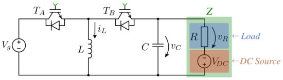 From Equation (10), it can be concluded that the equivalent load Z can be replaced by a load resistance in series with a DC source. By doing so, the equivalent single-phase circuit model of single stage Buck-Boost three-phase inverters can be represented by the electric circuit shown in Figure 3.