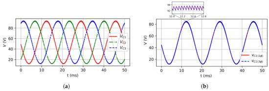 Capacitor voltages for RC load case: (a) Three-phase model; (b) Single-phase and three-phase