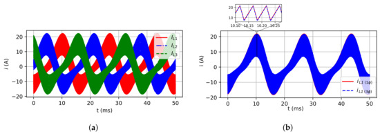 Inductor currents for RL load case: (a) Three-phase model; (b) Single-phase and three-phase